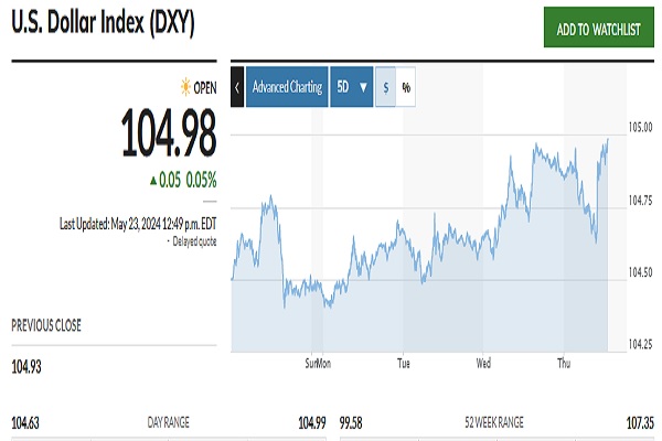 نکته مهمی که در رابطه با طلا و ارزهای دیجیتال باید به آن توجه کرد این است که حرکت شاخص دلار و قیمت در این بازارها رابطه معکوس با یکدیگر دارند. همانطور که در نمودار زیر مشاهده می کنید، شاخص دلار طی ۵ روز گذشته روند صعودی نسبتا قوی داشته است که نشان دهنده قدرت فزاینده پول داخلی آمریکا در بازار ارز است.