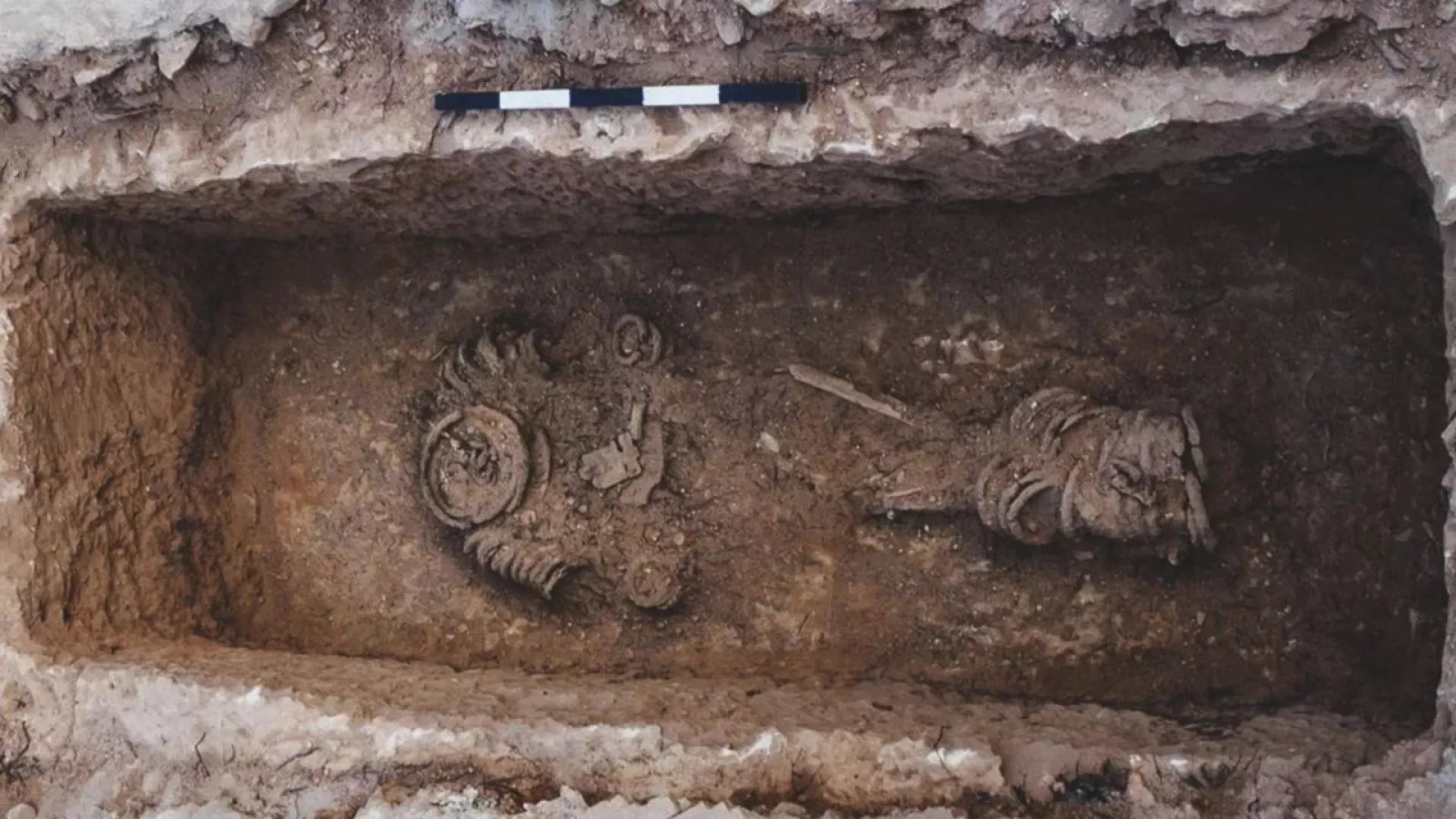 در میان این اکتشافات ، یک قبر حاوی بقایای شخصی بود که به طرز مرموزی زنجیر شده بود.