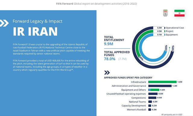 فیفا همچنین جزئیات پرداختی به هر فدراسیون را به صورت شفاف اعلام کرده است که بر اساس این گزارش سهم ایران تاکنون ۹.۹ میلیون دلار بوده است که از این میزان ۵.۵ میلیون دلار مربوط به هزینه های عملیاتی، ۴.۳ میلیون دلار به پروژه ها و ۰.۱ میلیون دلار بوده است. میلیون دلار. دلار به تجهیزات با این حال، ۷۸ درصد آن (۷.۷ میلیون دلار) تصویب شده است که ۱.۶ میلیون دلار به زیرساخت، ۱.۳ میلیون دلار به سیاست، ۰.۶ میلیون دلار به تجهیزات و ۰.۵ میلیون دلار به هزینه ها اختصاص می یابد. مجری، ۰.۵ میلیون دلار به مسابقات، ۰.۲ میلیون دلار به تیم های ملی، ۰.۲ میلیون دلار برای توسعه فوتبال و ۰.۲ میلیون دلار به فوتبال بانوان اختصاص یافته است.