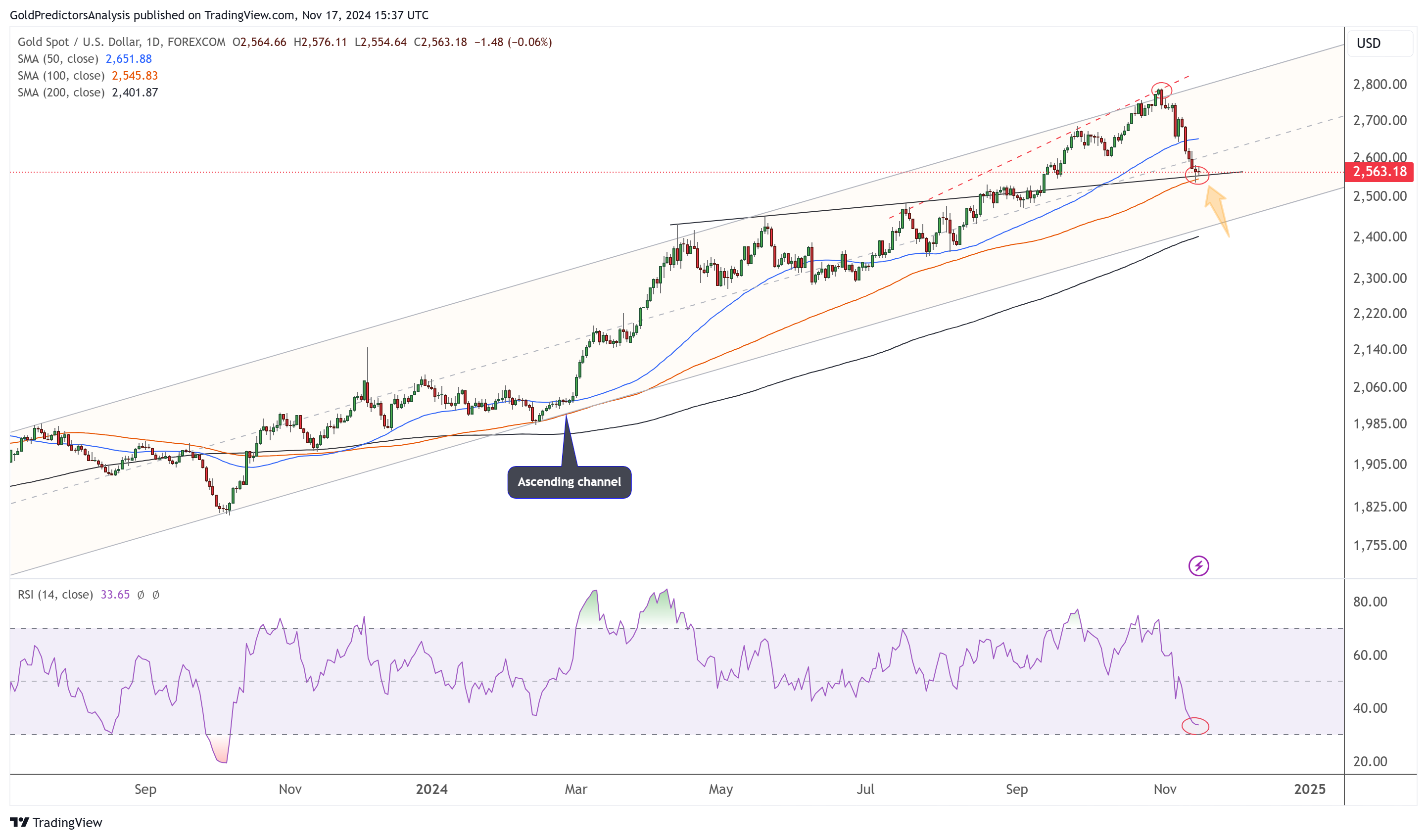 طلا توانسته است قیمت ۲۵۶۰ دلار را به عنوان پشتوانه قوی و کلیدی خود حفظ کند و این حمایت موازی با قیمت SMA 100 روزه طلا است. علاوه بر این، اندیکاتور RSI نیز در منطقه نزدیک به فروش بیش از حد قرار دارد که نشان دهنده احتمال بازگشت قیمت به روند صعودی است.