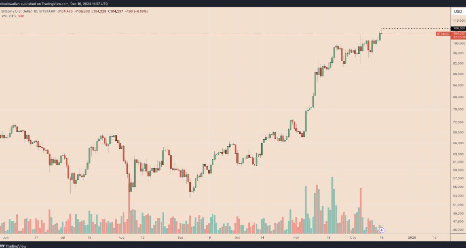 Nobitex به نقل از Cointelegraph، قیمت بیت کوین در ۱۶ دسامبر (۲۶ آذر) با رشد قابل توجهی به رکورد ۱۰۷۷۸۰ دلار دست یافت.