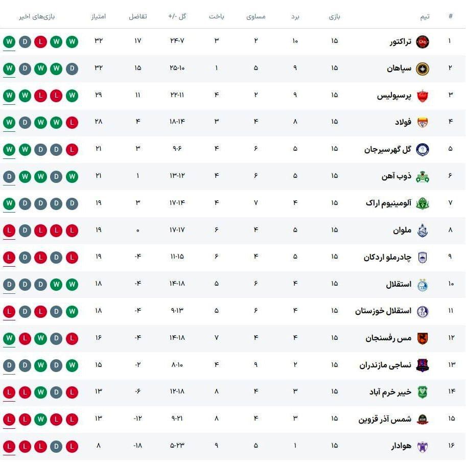 هفته پانزدهم رقابت های لیگ برتر امروز به پایان رسید و استقلال مقابل سپاهان به تساوی یک بر یک دست یافت تا تراکتور با ۳۲ امتیاز و تفاضل گل بهتر از سپاهان قهرمان نیم فصل شود.