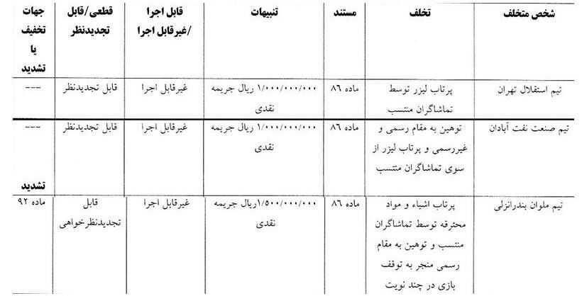 باشگاه استقلال به دلیل پرتاب لیزر توسط هواداران با حکم کمیته انضباطی ۱۰۰ میلیون تومان جریمه شد.