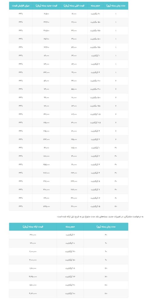 این اپراتور در انتهای جدول مقایسه قیمت، قیمت قبل و بعد از اصلاح قیمت را به شرح زیر منتشر کرد: