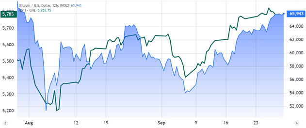 از سوی دیگر، کاهش شاخص S&P 500 بورس جهانی که از ۲۶ سپتامبر آغاز شد، همراه با آخرین داده های اقتصادی از چین که حاکی از تشدید رکود در این کشور است، فضای کاملاً منفی را برای سرمایه گذارانی که بیشترین تأثیر را دارند ایجاد کرده است. دارایی های پرریسکی مانند ارزهای دیجیتال خواهد داشت. در نمودار زیر می توانید میزان همپوشانی و هماهنگی حرکت شاخص بورس اوراق بهادار بزرگ جهان را با بیت کوین مشاهده کنید.