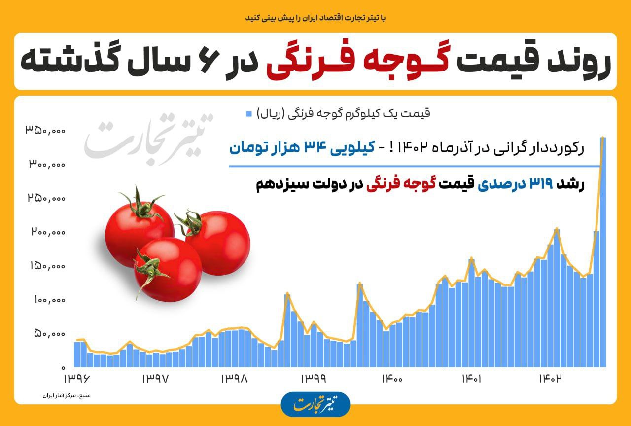 اگرچه مراکز دولتی حداکثر قیمت هر کیلوگرم گوجه فرنگی در مناطق شهری را ۴۳ هزار و ۵۹۲ تومان محاسبه کرده اند، اما در بررسی های میدانی برخی از خرده فروشی ها در برخی از مناطق تهران مانند جردن یا میرداماد، قیمت هر کیلوگرم گوجه فرنگی ۵۰ هزار تومان است. معادل یک دلار است. گذشت و تا ۷۰۰۰۰ تومان به فروش می رسد.