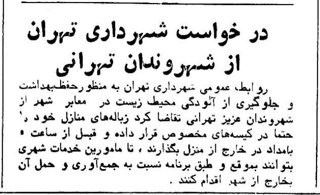 در تابستان ۱۳۶۳ شهرداری تهران برای اولین بار از مردم خواست که از کیسه های پلاستیکی مخصوص برای حمل زباله استفاده کنند. روزنامه اطلاعات ۸ شهریور ۱۳۶۳ شهرداری تهران در این زمینه آگهی منتشر کرد. قبل از استفاده از روش های مکانیزه آگهی را بخوانید و عکس جمع آوری زباله در محله های تهران را مشاهده کنید.