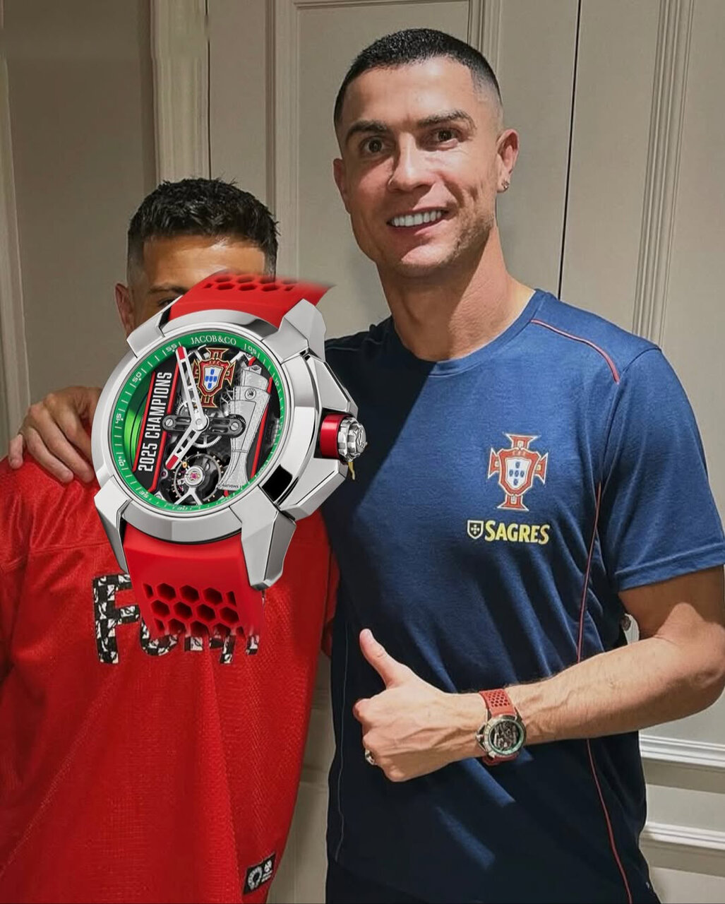 کریستیانو رونالدو با ساعتی خاص از Jacob & Co دیده شد این ساعت منحصرا برای جشن قهرمانی پرتغال در لیگ ملت های یوفا در سال ۲۰۲۵ ساخته شده است که از این مدل فقط ۳۵ عدد تولید شده است و جام پرتغال نیز در صفحه قرار داده شده است.