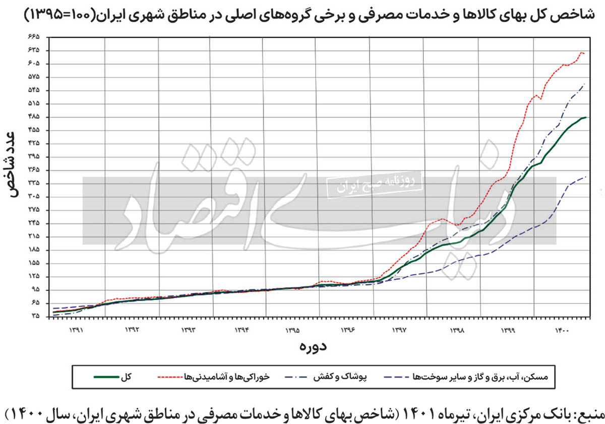 * در نمودار شاخص مسکن، آب و برق و غیره ادغام شده است. اما در متن تفصیلی به شاخص خالص مسکن نیز اشاره شده است که تقریبا معادل این شاخص میانگین است.