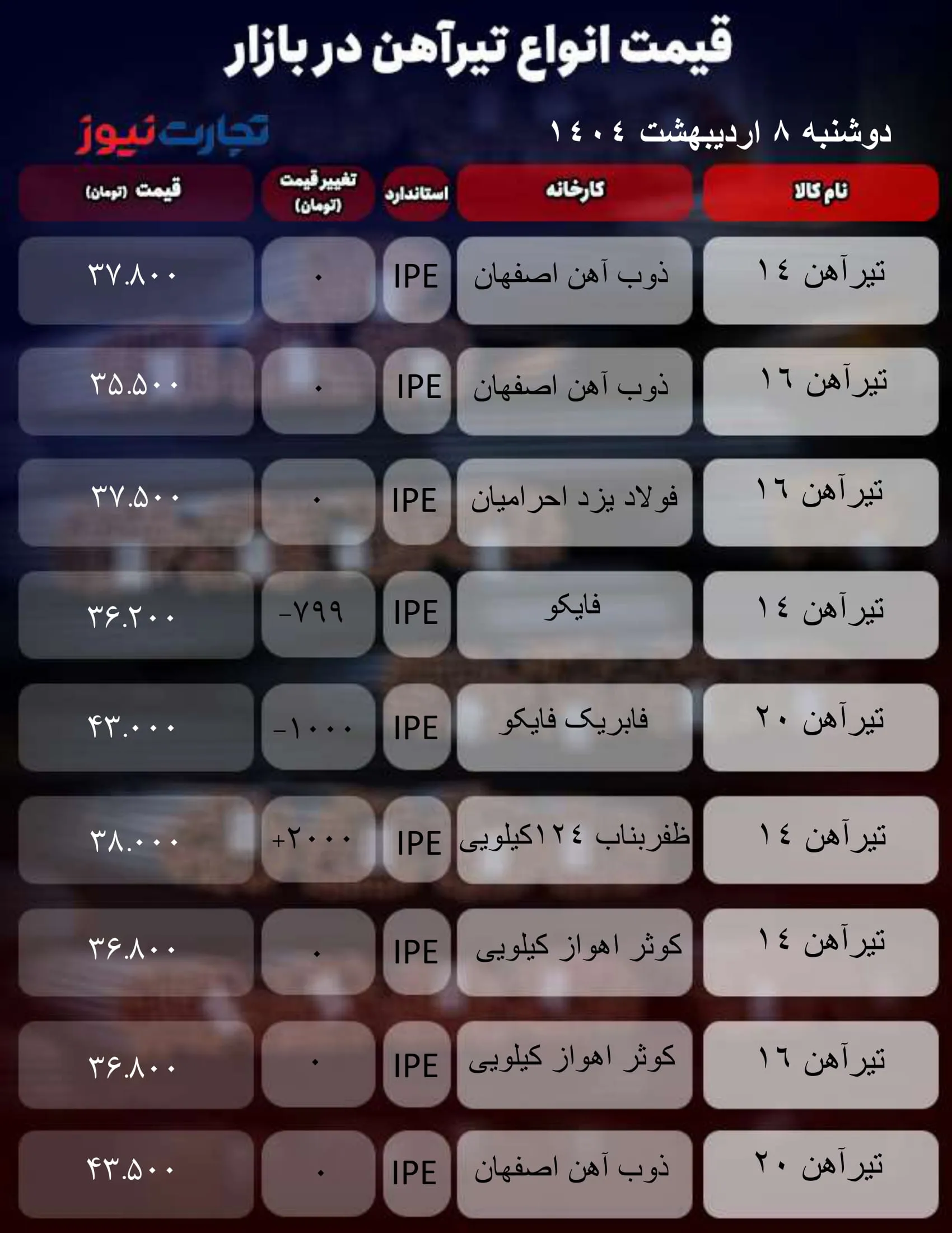قیمت تیرآهن امروز ۸ اردیبهشت ۱۴۰۴/ نوسان قیمتها زیر سایه انفجار بندرعباس و هیجان ارزی + جدول