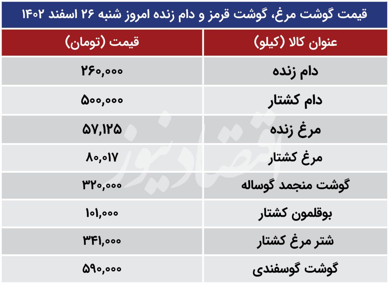 همچنین قیمت دام زنده امروز کیلویی ۲۶۰ هزار تومان و هر کیلو دام در کشتارگاه ۵۰۰ هزار تومان است.