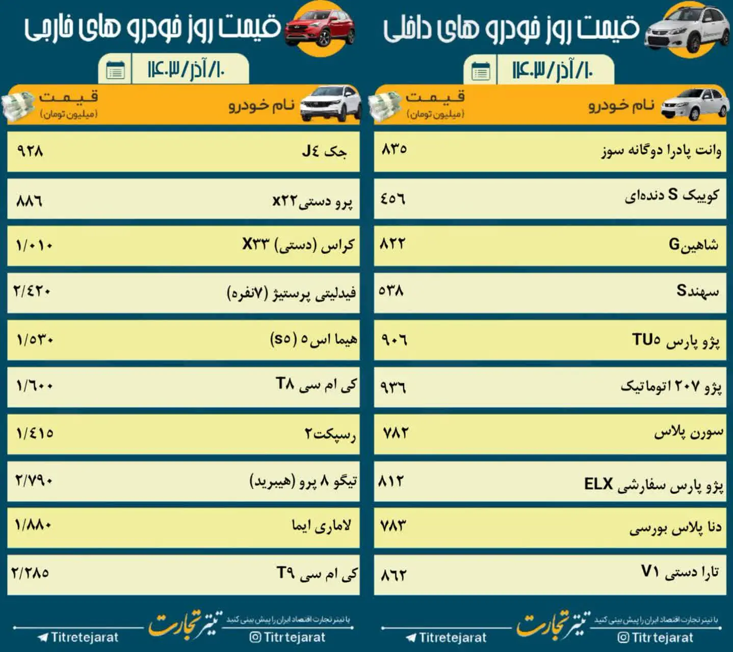 قیمت ماشین امروز ۱۰ آذر در سال ۱۴۰۳ کار خود را با Stability آغاز کرد. به این ترتیب قیمت اکثر محصولات خانگی و مونتاژی موجود در بازار نسبت به ۲۴ ساعت گذشته تغییر محسوسی نداشته است.