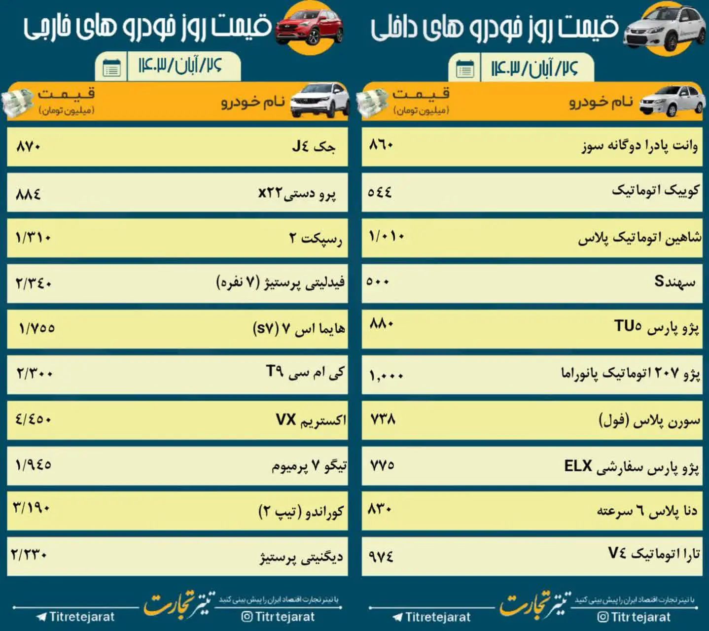 به گزارش افق میهن: قیمت خودروهای مختلف بسته به برند، مدل و مشخصات فنی متفاوت است و از چند میلیون تومان تا چند صد میلیون تومان متغیر است. عوامل زیادی مانند هزینه های تولید، تقاضای بازار و نوسانات ارز بر قیمت خودرو تاثیر می گذارد آبان ۱۴۰۳ اعلام شد. با توجه به تعطیلی روز گذشته و کمبود شدید خریدار در بازار، معاملات در بازار خودرو به صفر رسیده و خودروهای داخلی و مونتاژی اغلب بدون تغییر نسبت به هفته گذشته خرید و فروش می شوند.