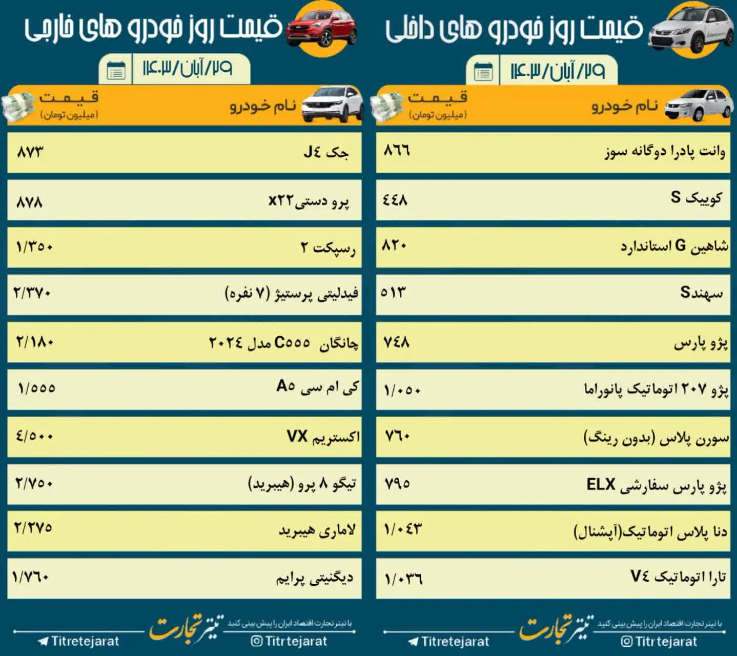 قیمت خودرو امروز 29 آبان ماه 1403 / بازار خودرو بهم ریخت