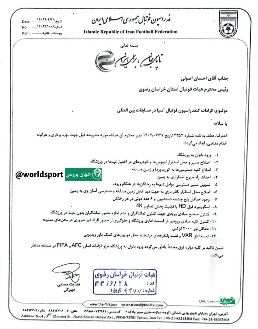 وی در این نامه از مدیرکل ورزش خراسان خواست تا تصویری از مصوبه شورای تامین استان مبنی بر موافقت با برگزاری مسابقات بین المللی با حضور بانوان در ورزشگاه های امام رضا(ع) و سامان الائمه مشهد ارائه کند. رونوشتی از این نامه به استانداری خراسان رضوی، مشهد و … ارسال شده است.