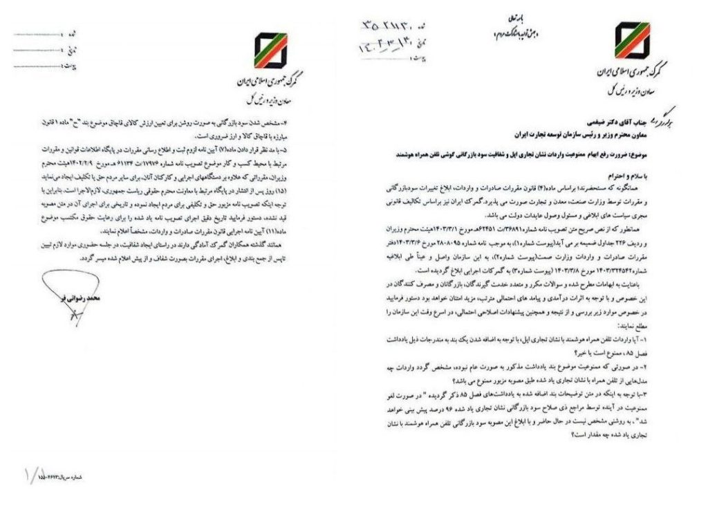 افق میهن، در نامه ای از سوی محمد رضوانی فر معاون وزیر اقتصاد و رئیس کل گمرک ایران به ضیغمی معاون حراست و رئیس سازمان توسعه تجارت با عنوان «لزوم رفع ابهام ممنوعیت واردات برند اپل و شفافیت سود». “تجارت تلفن همراه هوشمند” بیان می کند: