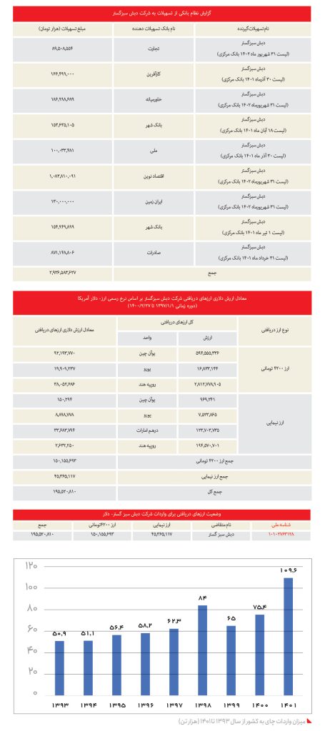 شرکت دابش سبزگستر ۳ میلیارد و ۳۷۰ میلیون دلار ارز دریافت کرده است. با این میزان ارز می شد ۷.۵ سال نیاز کشور به چای خارجی را تامین کرد.