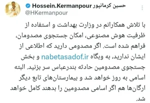 حسین کرمانپور ، رئیس مرکز روابط عمومی و اطلاعات وزارت بهداشت ، خانواده های مجروحان در بندر عباس را توییت کرد.