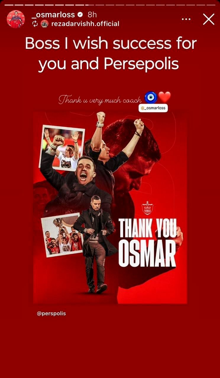 رضا درویش مدیرعامل پرسپولیس با انتشار استوری اینستاگرامی از زحمات اسمار تشکر کرد و این بازیکن برزیلی در پاسخ گفت: