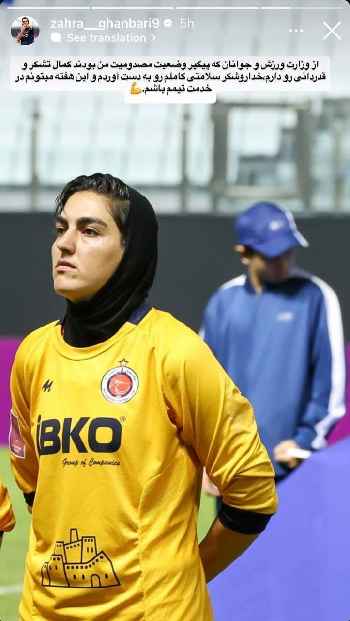زهرا قنبری ستاره تیم خاتون بم پس از غیبت در بازی اخیر این تیم در لیگ برتر فوتبال بانوان با انتشار مطلبی از بازگشت خود به مسابقات خبر داد.