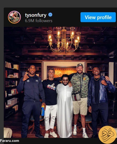 تایسون فیوری، آنتونی جاشوا و فرانسیس انگانو که فوق ستاره های دنیای بوکس هستند در کنار کریستیانو رونالدو ایستاده اند و دست به دست هم داده اند. فیوری اشاره کرد که محل ثبت این عکس شهر ریاض بوده است. را