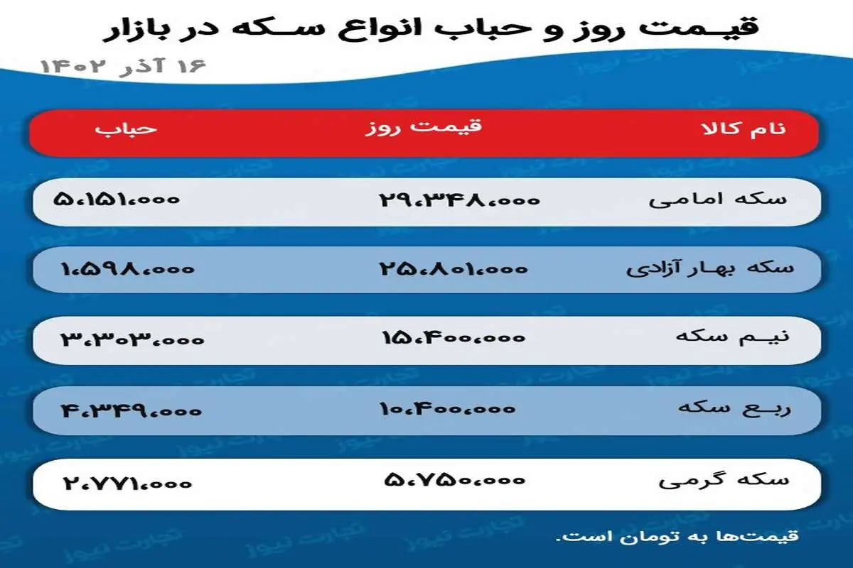 قیمت نیم سکه و ربع سکه با ۵۰ هزار تومان افزایش به ترتیب ۱۵ میلیون و ۴۰۰ هزار تومان و ۱۰ میلیون و ۴۰۰ هزار تومان معامله شد. سکه گرم دیروز تنها قطعه ای بود که قیمت آن تغییری نکرد و روی پنج میلیون و ۷۵۰ هزار تومان ایستاد.