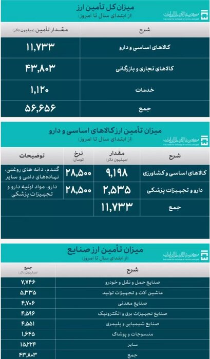 بر این اساس یک میلیارد و ۵ میلیون دلار آمریکا از محل ارز شرکت ها و گروه های تجاری تخصیص می یابد. “صنایع حمل و نقل و خودرو”، تولید ماشین آلات و تجهیزات” و “مواد معدنی” به ترتیب با ۱.۵ میلیارد دلار، ۱.۵ میلیارد دلار و ۱.۵ میلیارد دلار آمریکا.