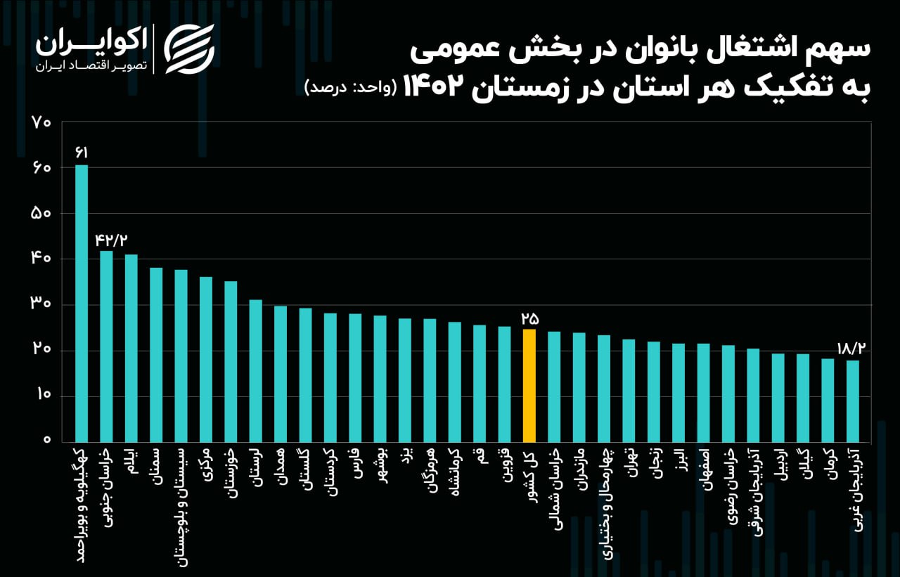 در زمستان ۱۴۰۲، سهم اشتغال زنان در بخش دولتی بین ۱۸.۲ تا ۶۱ درصد در نوسان بود. در استان کهگیلویه و بویراحمد از هر ۱۰ زن شاغل بیش از ۶ نفر در بخش دولتی مشغول به کار بوده اند. به این ترتیب این استان بیشترین سهم را از اشتغال زنان در بازار کار دارد.