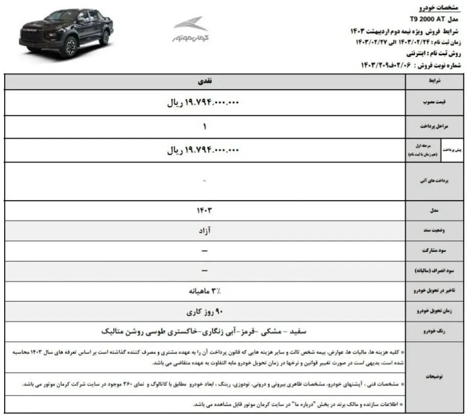 ثبت نام این وانت کرمان موتور به صورت اینترنتی و به آدرس انجام می شود. رنگ های پیکاپ T9 در این طرح فروش سفید، مشکی، قرمز، آبی زنگ زده و متالیک خاکستری روشن است.