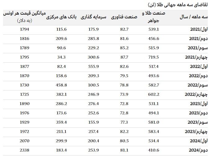 همانطور که این جدول نشان می دهد، به استثنای معدودی، تقاضا از سوی صنایع طلا و جواهر و فناوری محدود باقی مانده است، در حالی که تقاضای بانک مرکزی در دو سال گذشته به میزان قابل توجهی افزایش یافته است و همچنین علاقه سرمایه گذاران نیز افزایش یافته است.