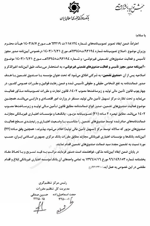 در این بخشنامه آمده است: علاوه بر تصویر تصویب نامه شماره ۱۱۸۱۲۴ / ت ۶۳۲۱۹ هجری قمری مورخ ۰۷/۰۸/۱۴۰۳ هیئت وزیران در خصوص اصلاحیه تصویب نامه شماره ۹۲۱۹۴ / ت ۶۲۹۴۵ هجری قمری مورخ ۲۱/۰۶/۲۱. ۱۴۰۳ در خصوص آیین نامه صدور پروانه ایجاد و بهره برداری از صندوق ها با ضمانت نامه غیردولتی و مورخ ۹۲۱۹۴/ت ۶۲۹۴۵ ق ۱۴۰۳ / ۰۶ / ۲۱ / ۱۳۹۳ موضوع اساسنامه صدور مجوز تاسیس و فعالیت صندوق های ضمانت غیردولتی. بر اساس اساسنامه فوق الذکر و اصلاحات بعدی، صندوق ضمانت به شرکتی اطلاق می شود که تحت عنوان «موسسه یا صندوق ضمانت به منظور صدور ضمانت نامه به نفع اشخاص حقیقی و حقوقی است. مقرر در قانون و مشمول قوانین و مقررات عمومی کشور در چارچوب قانون تامین مالی تولید و زیربنایی مصوب ۱۴۰۲، قانون تجارت و مفاد تصویب نامه مذکور، مشمول نظارت می باشد. مرکز تسهیل تامین فاینانس یک تولیدی است که در وزارت اقتصاد و دارایی مستقر است. فعالیت صندوق های ضمانت نیز بر اساس قانون تامین مالی تولید و زیرساخت مصوب ۱۴۰۲ صدور انواع ضمانت نامه می باشد. بر اساس تبصره ۲ ماده (۲۱) تصویب نامه مذکور، بانک ها و مؤسسات اعتباری غیربانکی مجازند نسبت به پذیرش ضمانت نامه های صادره از سوی صندوق های ضمانت مطابق با طبقه بندی اعتبار و سطح فعالیت وجوه مذکور که هر ساله توسط صندوق های ضمانت نامه اعلام می شود، اقدام کنند. مرکز تسهیل تامین مالی (تولید). بر اساس ماده (۲۲) آیین نامه، بانک ها و مؤسسات اعتباری غیربانکی مجازند نسبت به ضمانت مجدد ضامن صندوق های ضمانت بر اساس مقررات بانک مرکزی جمهوری اسلامی ایران اقدام کنند.