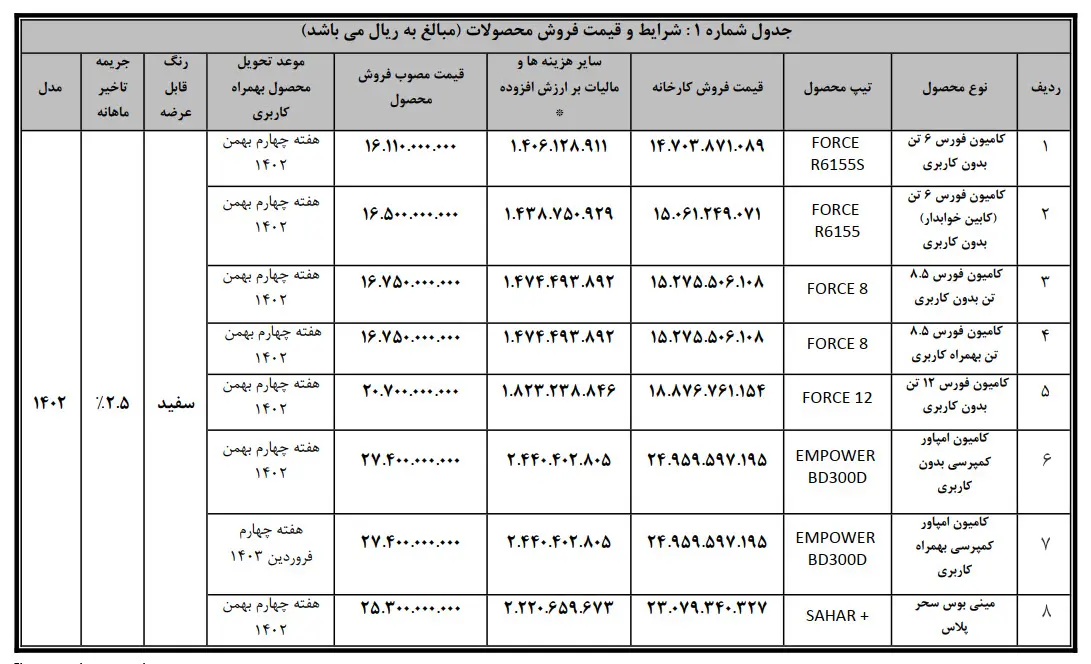 در این طرح فورس کابین های ۶ تنی تخت خواب طبق جدول زیر با پیش پرداخت و اقساط سه، شش و ۱۲ ماه و یک سال بیمه بدنه به فروش می رسد. خرید محصول فقط با استفاده امکان پذیر است و تاریخ تحویل هفته گذشته است بهمن سال ۱۴۰۲ است.