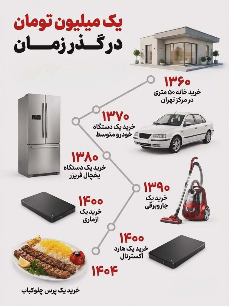 به گزارش اقتصاد ۲۴، با یک میلیون تومان در سال ۶۰ می شد خانه ای ۵۰ متری در مرکز تهران خرید; بعد از ۴۴ سال حالا با یک میلیون تومان فقط می توان یک پرس چلوکباب خرید.