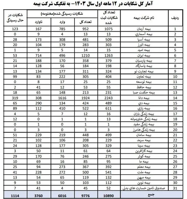 با توجه به پویایی عملکرد و تغییرات عوامل موجود در این جداول ، با این حال ، موقعیت شرکت های بیمه هر ماه تغییر می کند و هر ماه درصد شکایات در شرکت های مختلف بین ماه های دیگر متفاوت خواهد بود. علاوه بر این ، نسبت شرکت های سبد بیمه در آمار بیمه شکایت نباید نادیده گرفته شود. به عنوان مثال ، البته این است که تعداد شکایات یک شرکت با سهم ۵ ٪ در کل صنعت بیمه بالاتر از شرکت هایی است که سهم کمتری دارند. از آنجا که جمعیت آماری و بیمه گذاران این شرکت ها به مراتب بیشتر و بالاتر از جمعیت آماری شرکت های بیمه کوچکتر هستند.