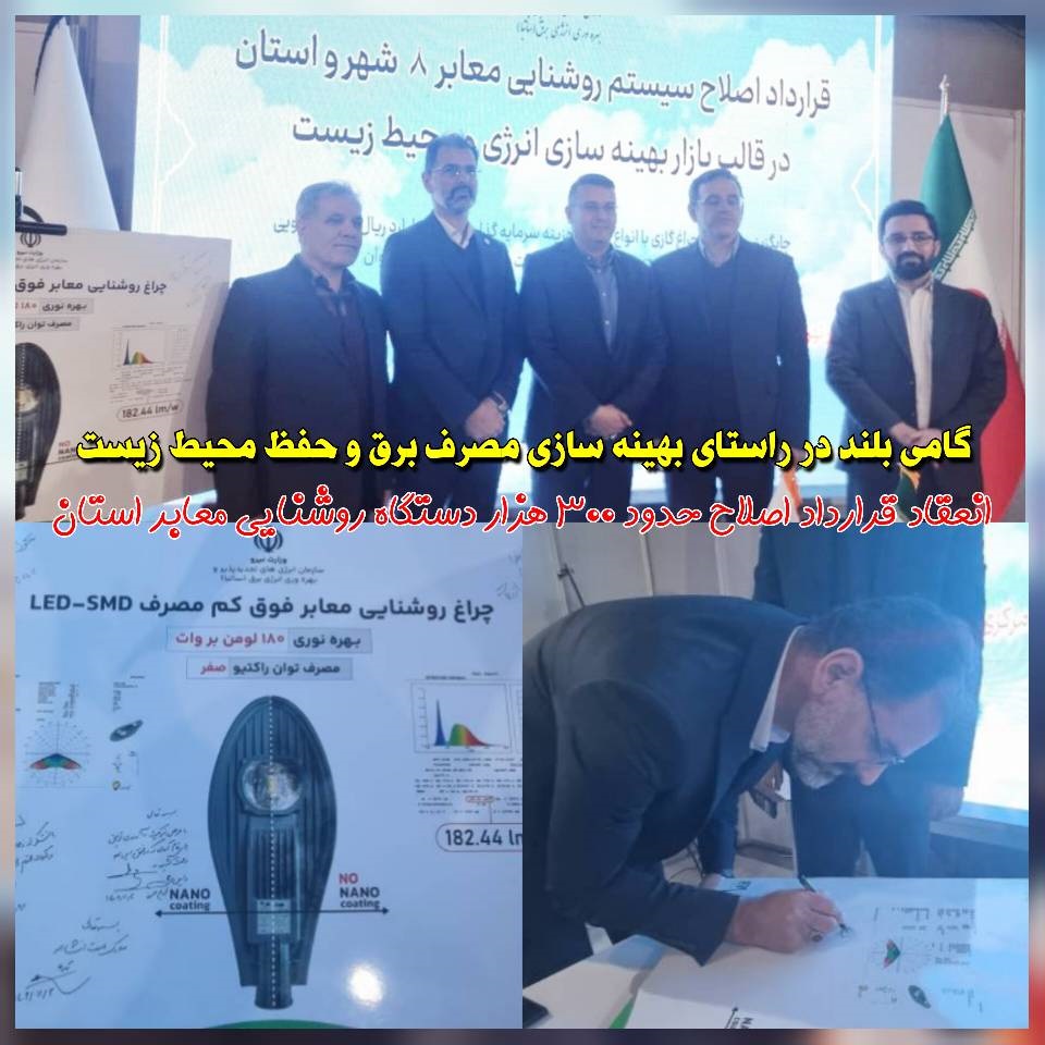 با حضور علی اکبر محرابیان وزیر نیرو قرارداد اصلاح حدود ۳۰۰ هزار دستگاه روشنایی معابر استان فیما بین شرکت توزیع نیروی برق گیلان و سازمان انرژی های تجدیدپذیر و بهره وری برق (ساتبا) منعقد شد.