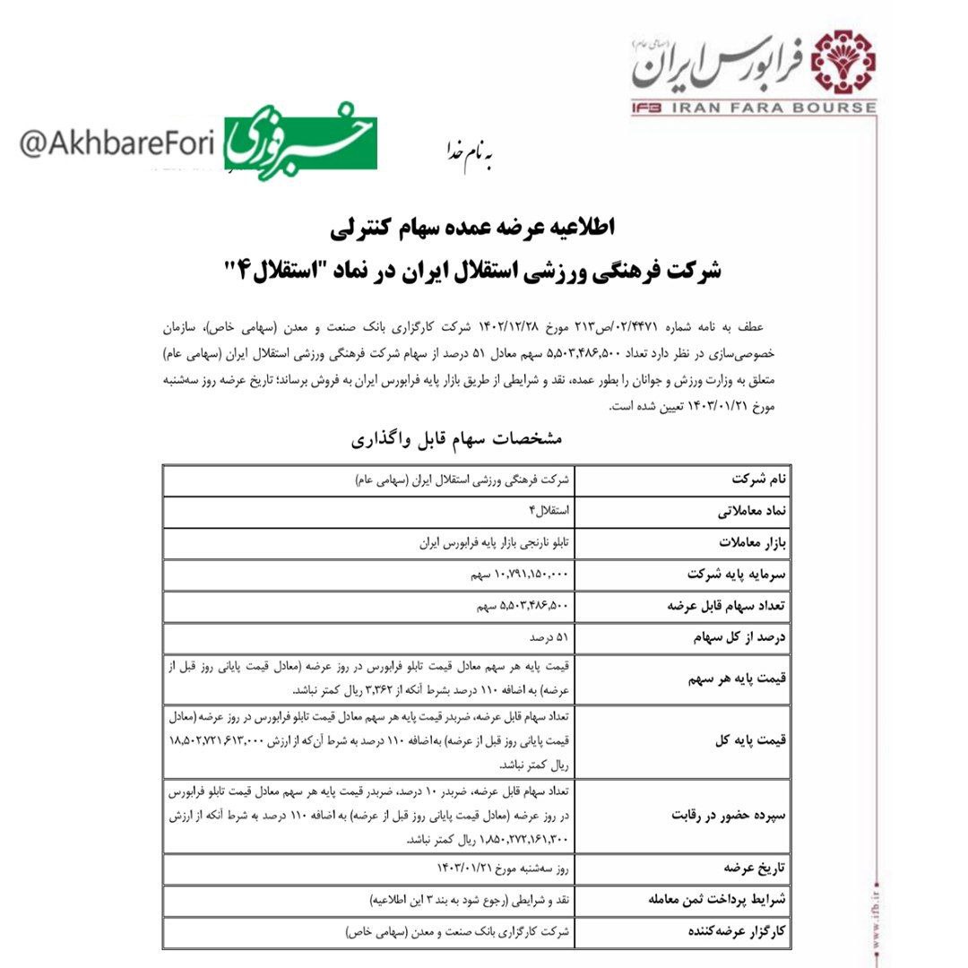 سازمان بورس ایران اعلام کرد: سازمان خصوصی سازی در نظر دارد ۵ میلیون و ۵۰۳ هزار و ۴۸۶ هزار و ۵۰۰ سهم معادل ۵۱ درصد از سهام شرکت فرهنگی ورزشی استقلال ایران (سهام عمومی) متعلق به وزارت ورزش و جوانان را به صورت عمده، نقدی و شرایط از طریق بازار پایه ارز ایران. ارائه؛ تاریخ انتشار برای سه شنبه ۲۱/۰۱/۱۴۰۳ تعیین شده است.