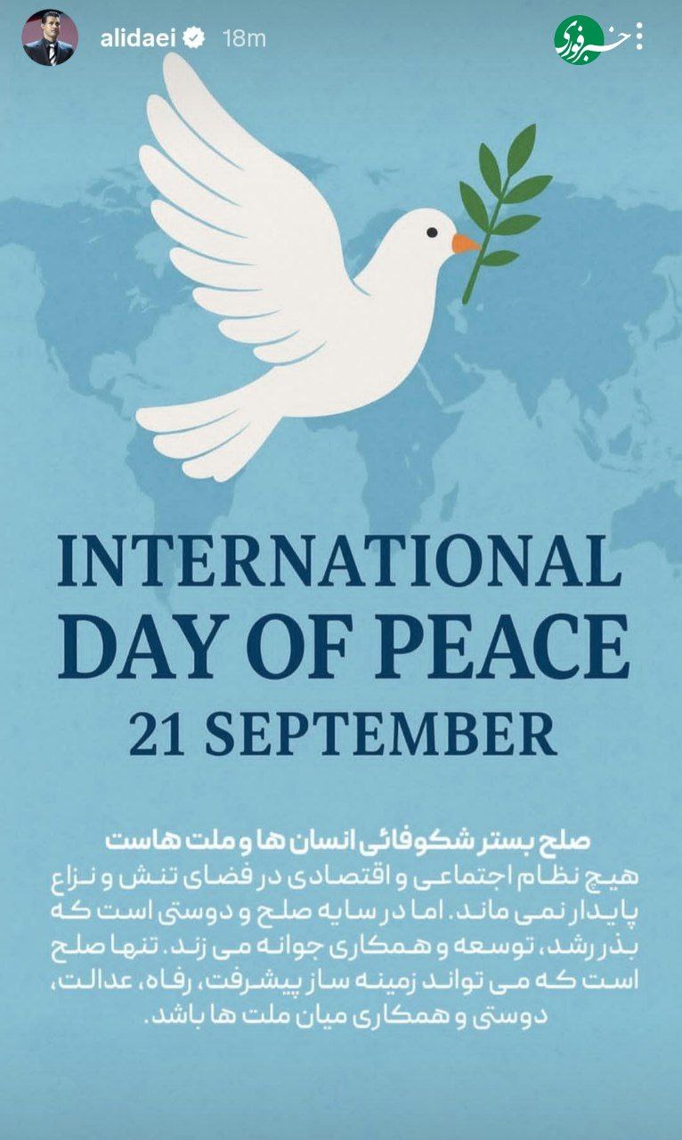 علی دائی به مناسبت روز صلح جهانی در داستان اینستاگرام خود نوشت: صلح اساس شکوفایی انسان و ملل است ، هیچ سیستم اجتماعی و اقتصادی در جو تنش و نزاع پایدار نیست.