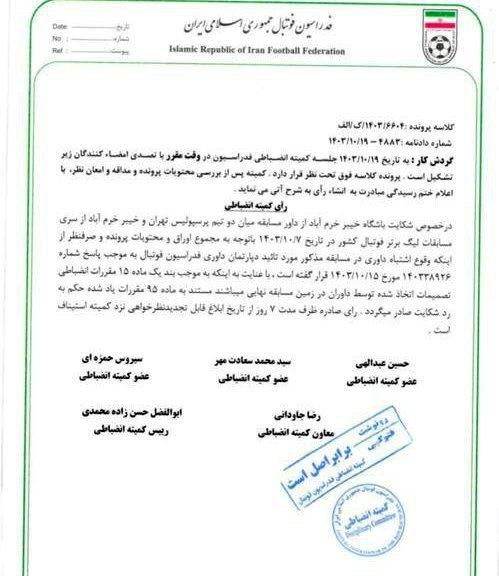 در خصوص شکایت باشگاه خیبر خرم آباد از داور بازی پرسپولیس تهران و خیبر خرم آباد از سری مسابقات لیگ برتر فوتبال کشور در تاریخ ۷/۱۰/۱۳۰۳ با توجه به مجموع اسناد و محتویات پرونده و بدون توجه وقوع خطای داوری در مسابقه مذکور طبق شماره پاسخنامه به تایید دپارتمان داوری فدراسیون فوتبال رسیده است. ۱۴۰۳۳۸۹۲۶ مورخ ۱۴۰۳/۱۰/۱۵. با توجه به اینکه طبق بند یک ماده ۱۵ آیین نامه انضباطی تصمیمات داوران در زمین مسابقه قطعی است، بر اساس ماده ۹۵ آیین نامه مذکور، رای رد شکایت صادر می شود. رأی صادره ظرف مدت ۷ روز از تاریخ ابلاغ قابل اعتراض در کمیته استیناف می باشد.