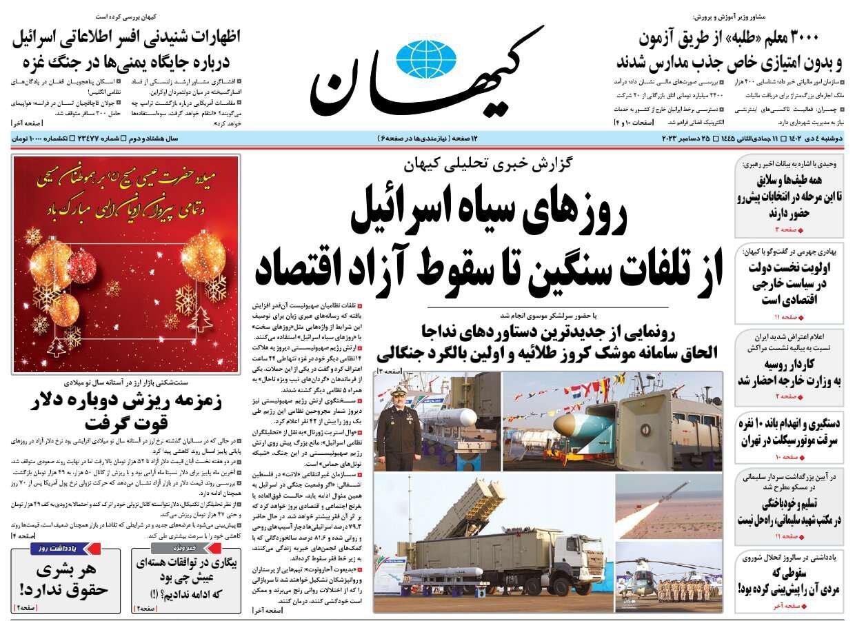 روزنامه کیهان در صفحه اول امروز با تیتر “روزهای سیاه اسرائیل، از تلفات سنگین تا سقوط آزاد اقتصاد” وی نوشت: روز گذشته «وال استریت ژورنال» به نقل از «تحلیلگران نظامی اسرائیل» نوشت بزرگترین مانع پیش روی ارتش رژیم صهیونیستی در این جنگ «شبکه تونل های حماس» است. بر اساس این گزارش، «شبکه عمیق و گسترده تونل های حماس مانع بزرگی برای ارتش اسرائیل برای کنترل اراضی غزه است». قطعاً تلفات سنگین صهیونیست ها دلایل دیگری هم دارد که مقابله با آنها فرصت دیگری می طلبد. در اینجا تنها به اظهارات کارشناس بی بی سی اشاره می کنیم. یک کارشناس بی بی سی دیروز گفت: اسرائیل در باتلاقی گیر کرده است که راه حلی ندارد. آنها در این جنگ چیزی به دست نیاوردند و تاکنون حماس در این جنگ پیروز شده است. نابودی حماس غیرممکن است. دیروز نیز اخباری از جبهه های جنگ غزه منتشر شد که می تواند به تحلیل تلفات سنگین این رژیم کمک کند! خبر این بود: خشم ارتش اسرائیل القسام; حمله حماس به سربازان اسرائیلی با استفاده از سلاح های اسرائیلی (!). قسامشاخه نظامی حماس اعلام کرد که جنگنده های این گردان با استفاده از دو موشک ۲ تنی این رژیم که در هنگام شلیک به منازل غیرنظامیان فلسطینی عملیاتی نشده بود، ۵ تانک اسرائیلی را منهدم و تمامی سرنشینان آن را کشته یا زخمی کردند.