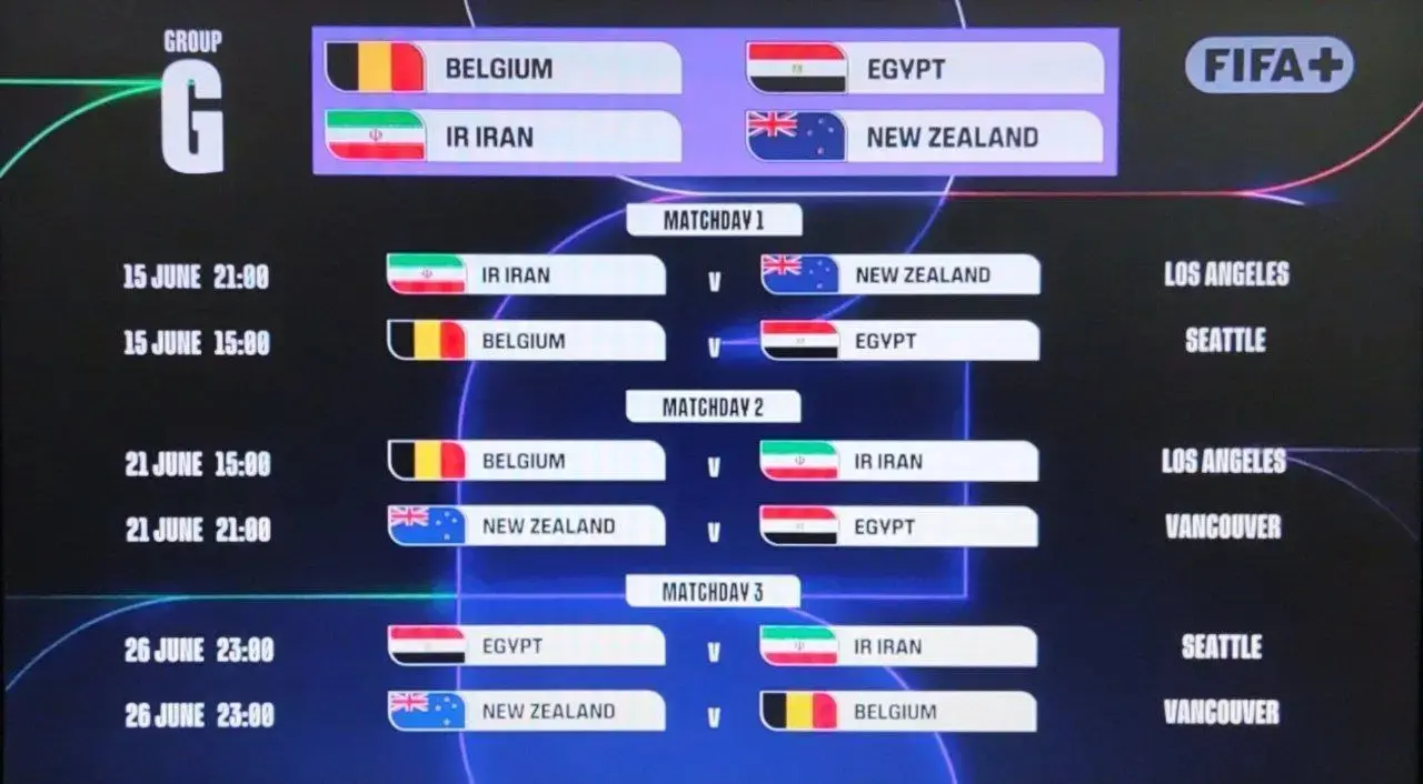 طبق اعلام رسمی فیفا، تیم ملی ایران که در کنار تیم های بلژیک، مصر و نیوزلند قرار گرفته است، مسابقات خود را در این ساعت و تاریخ برگزار خواهد کرد.