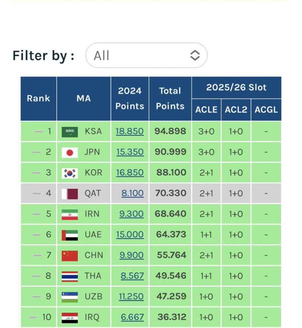 بر اساس این رده بندی، سهمیه ایران در لیگ قهرمانان آسیا ۲۰۲۴-۲۰۲۵ که با فرمت جدید برگزار می شود به شرح زیر است: سهمیه ۱+۲ ایران در لیگ دسته اول آسیا (۲ سهمیه مستقیم و یک پلی آف) به عنوان و همچنین یک سهمیه ایران. مستقیماً در لیگ دسته دوم آسیا شرکت خواهد کرد.
