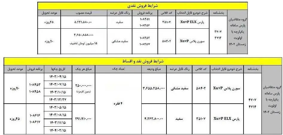 به گزارش افق میهن، ایران خودرو در اطلاعیه ای اعلام کرد با توجه به احتمال تولید خودرو پژو پارس تا پایان بهار ۱۴۰۳، شرایط انتخاب و پرداخت برخی از متقاضیان خرید خودرو پژو پارس XU7P بر اساس اولویت ثبت نام تعیین شده است. در جداول پیوست شرح داده شده است.