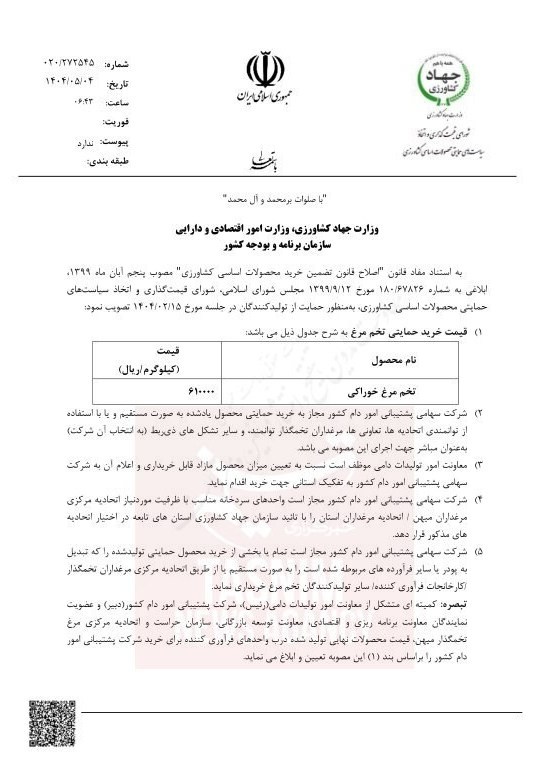 جهاد وزارت کشاورزی از میزان خرید تخم مرغ برای کشاورزان در ۶۱۰۰۰ تومانس خبر داد. این هدف برای حمایت از تولید کنندگان است و در صورت عدم دسترسی محصول آن در بازار مشتری توسط دولت خریداری می شود.