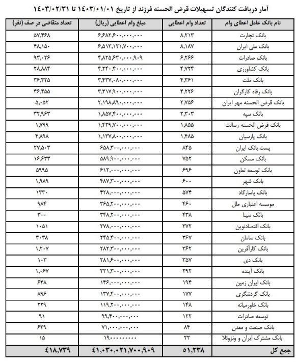 بر اساس اعلام بانک مرکزی، تا پایان اردیبهشت ۵۱ هزار و ۲۳۸ نفر وام کودک دریافت کرده اند که بانک تجارت با ۸ هزار و ۲۱۳ وام رتبه اول، بانک ملی با ۸ هزار و ۱۸۷ وام و بانک صادرات با ۶ هزار و ۲۶۶ وام رتبه های یک تا سوم را به خود اختصاص داده است. مستند پرداخت این تسهیلات انجام می شود.
