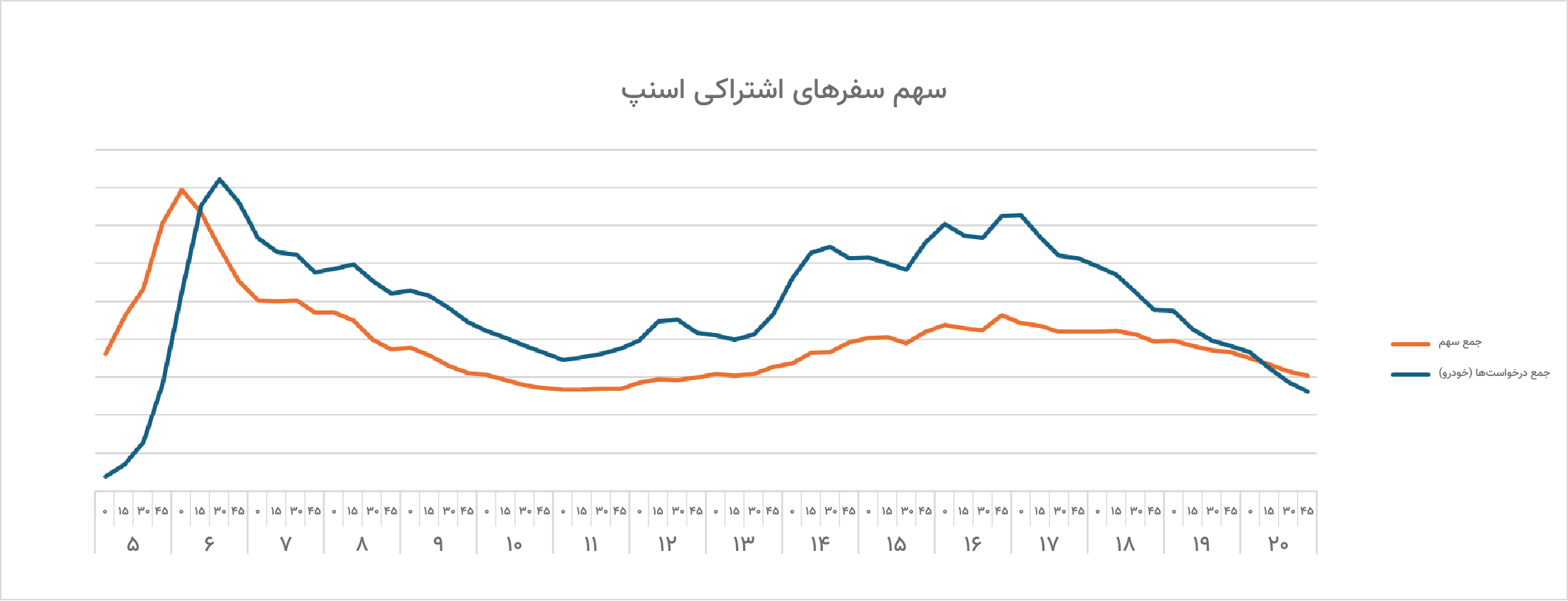 نمودار نسبت تقاضا به عرضه سفرهای اسنپ در ۱۰ شهر پرترافیک کشور که نشان می دهد بیشترین تقاضا در ساعات ۷ صبح، ۱۲:۳۰ و ۱۶:۳۰ تا ۱۹ ثبت شده است.