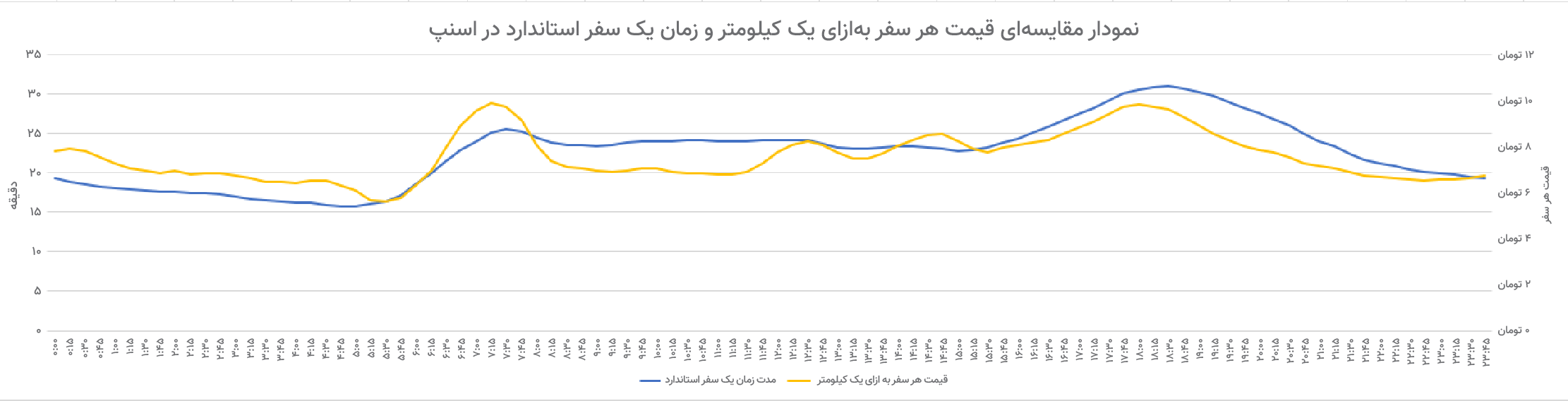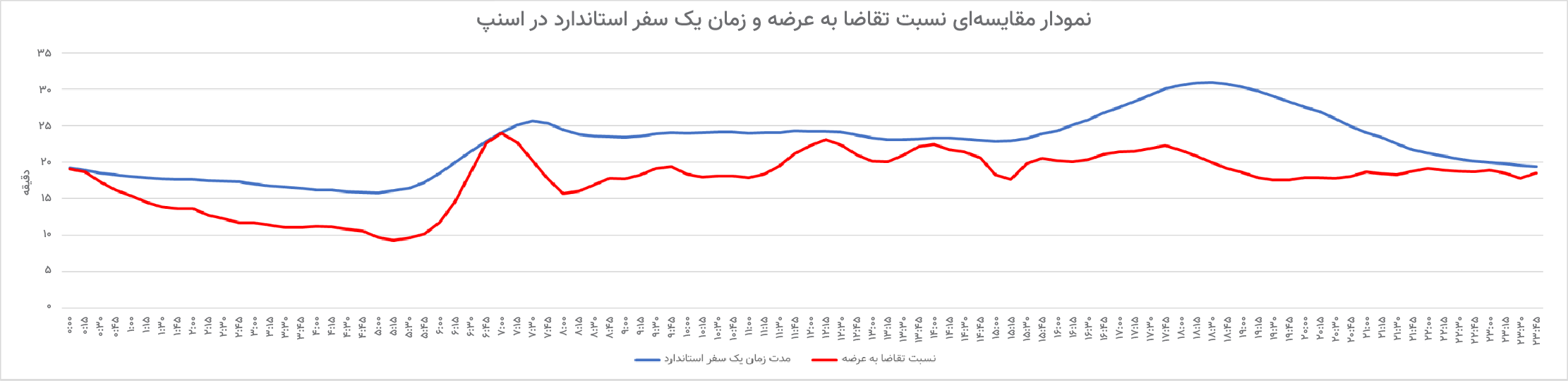 نمودار مقایسه نسبت تقاضا به عرضه و زمان یک سفر استاندارد اسنپ در طول شبانه روز (در این نمودار نسبت تقاضا به عرضه به صورت نسبی محاسبه می شود. همچنین سفر استاندارد به زمان سفر یک کیلومتر ثابت اشاره دارد).