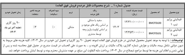 افق میهن به نقل از فارس; شرکت بهمن موتور فروش فوری ۲ دستگاه خودرو مونتاژ شده (چینی) از دیروز (دوشنبه ۲۳) بهمن) به ثبت نام کنندگان در سامانه یکپارچه با موعد تحویل زمستان ۱۴۰۲ و این ثبت نام تا ساعت ۲۴ روز پنجشنبه سوم باز است. اسفند ادامه دارد. بر اساس این اطلاعیه قیمت Fidelity Prime Type 1 13,310,000,000 ریال و قیمت Fidelity Prime Type 2 13,353,000,000 ریال تعیین شده است.