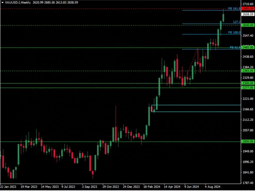 سومیا شورابی; بازار: در نمودار هفتگی اونس طلا (XAUUSD)، روند بلندمدت بازار صعودی است. اخیرا، اونس طلا به قیمت ۲۶۸۵.۵۶ رسیده است که مطابق با برآورد فیبوناچی ۱۶۱.۸ درصد، سطح تاریخی جدید برای اونس است.