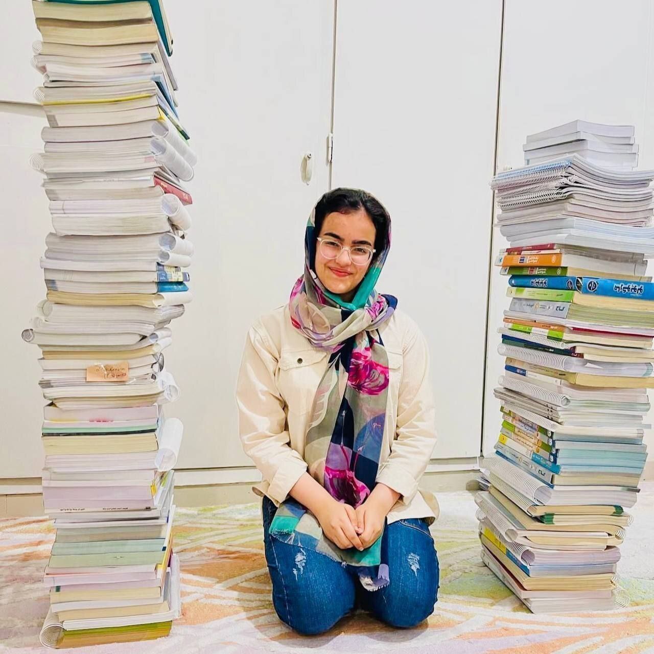 عکس زیر مربوط به صبا معصوم نیا رتبه ۱ بندرعباس و دفترچه های امتحانی است.