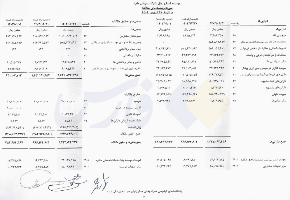 لازم به ذکر است با توجه به عدم تعادل مالی در موسسه مالی و اعتباری ملی و همچنین سرمایه گذاری های غیرقانونی این موسسه در حوزه املاک و تجاری، بانک مرکزی بر اساس ماده ۳۰ قانون جدید بانک مرکزی، هیات مدیره فعلی موسسه ملی را عزل کرد. با این تصمیم هیات نظارت منصوب از سوی بانک مرکزی مدیریت موسسه ملل را بر عهده گرفت.
